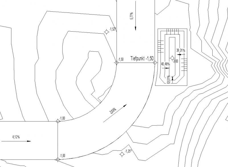 In dieser Phase werden die Hauptentwasserungspunkte mit Höhenkoten und Gefälleangaben (Neigungen) versehen.