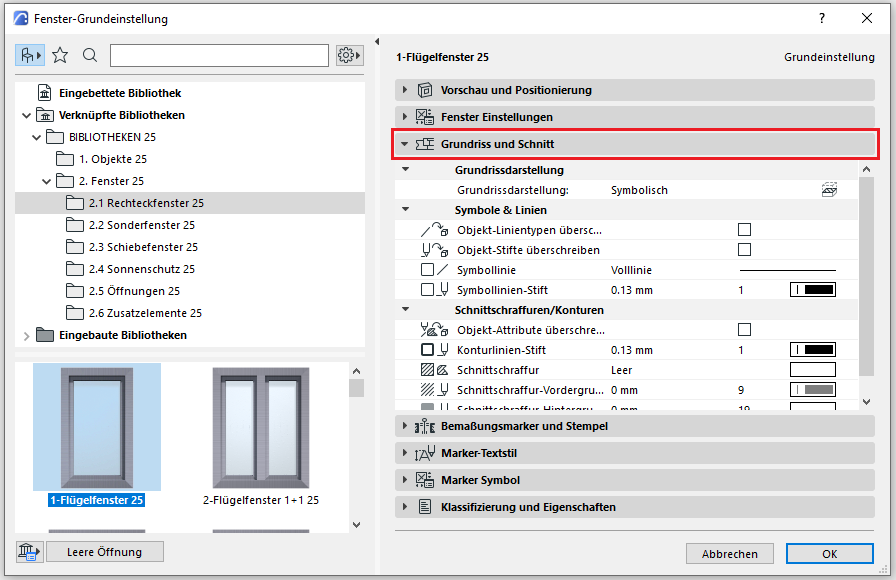 In dem Reiter der verschiedenen Bibliotheksobjekt-Einstellungen sollte man das Zubehör und die Öffnungslinie ausschalten, um die Optik der Fenster weiterhin zu schematisieren.