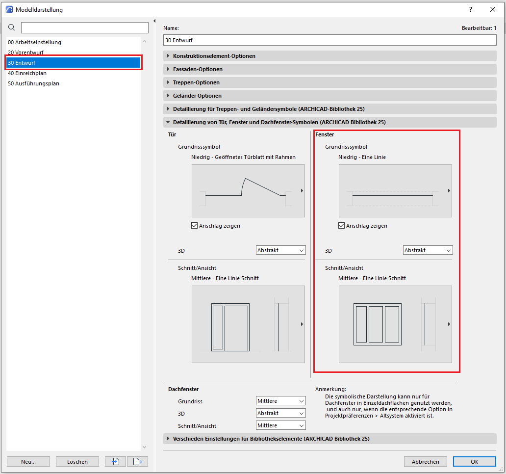 Der phasengerechte Detaillierungsgrad der Fenster kann mit der Modelldarstellungsoptionen reguliert werden. Wichtige Voraussetzung ist, dass die 2D- und 3D-Darstellungsoptionen in der Elementeinstellungen der Fenster auf „Nach Modelldarstellung“ gestellt wurden. In der Phase Einreichung sollten folgende Einstellungen durchgeführt werden.