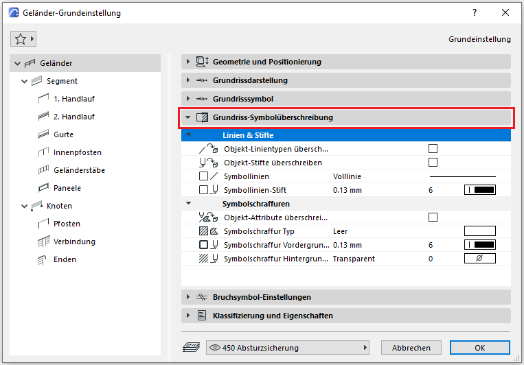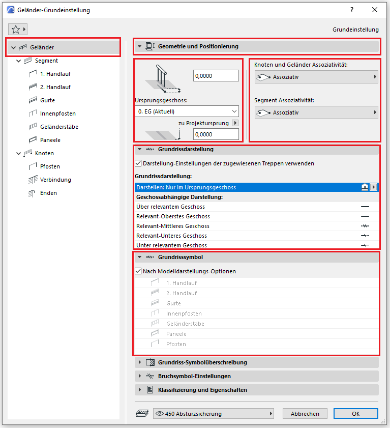 - Man kann individuell auswählen, welche Komponenten des Geländers im Grundrissbereich angezeigt oder ausgeblendet werden sollen. Diese Optionen betreffen den 3D-Bereich nicht. In der Ausführung werden bestimmten Elemente des Geländers dargestellt.
