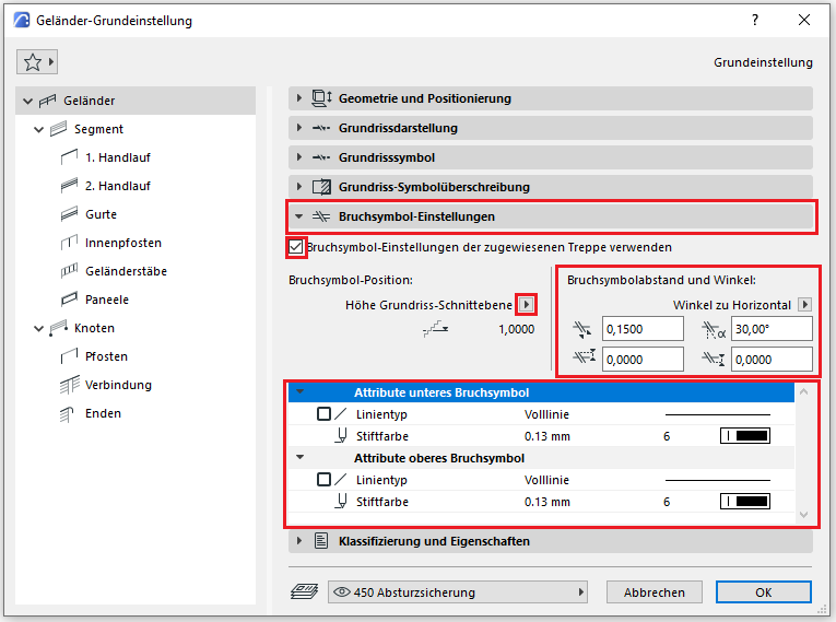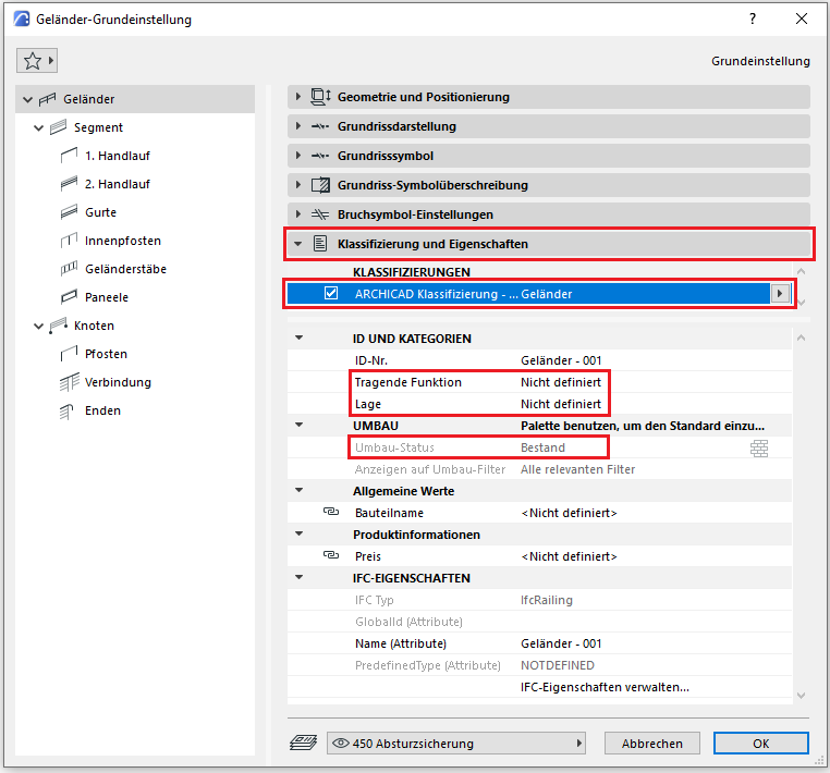 Nach Auswahl eines Geländers und Anwendung des Befehls »Typ bearbeiten« stehen die Einstellungen im Typeneigenschaften-Fenster zur Verfügung: