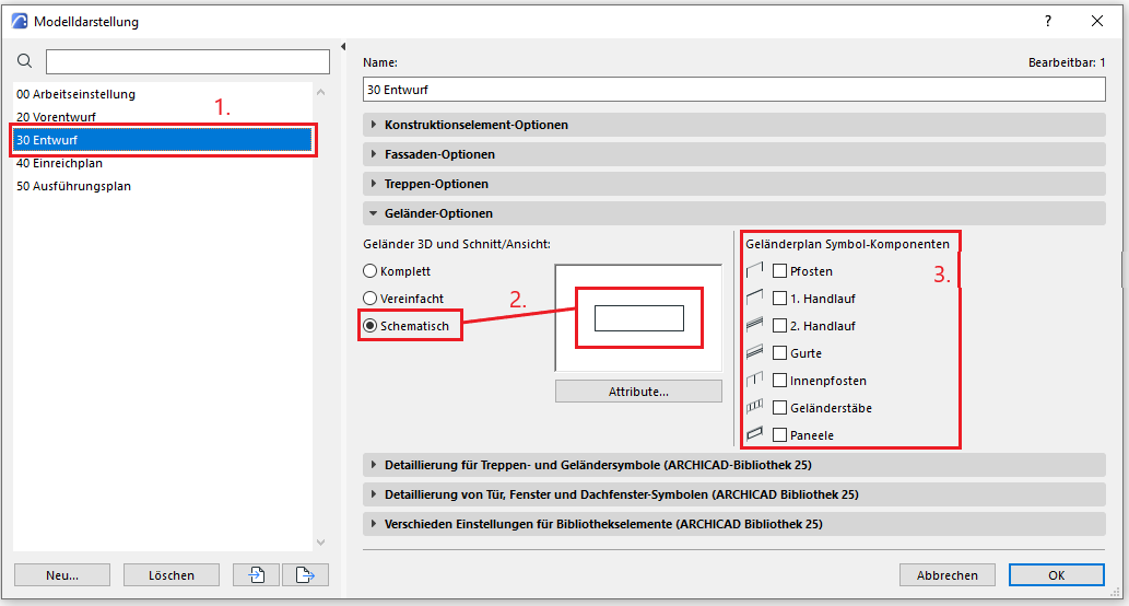 - Diese Einstellung wird im 3D-Modellbereich die Geländer-Elemente global, einheitlich detaillieren. In dem Vorschaufenster ist es ersichtlich, wie alle Teile des Geländers angedeutet sind.