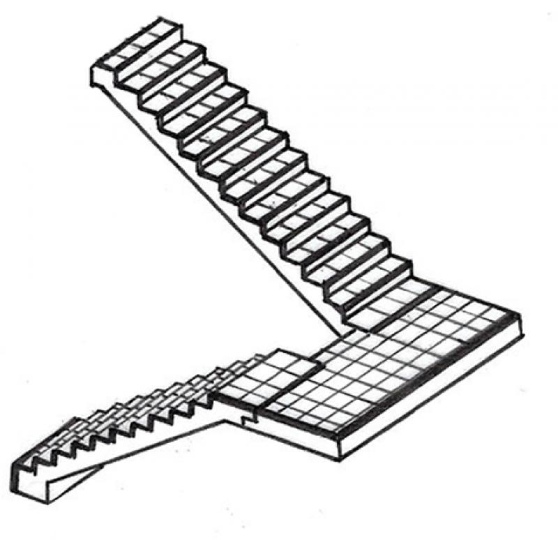 Im gewählten Grundriss anschließend die Treppe mit gewünschtem Verlauf skizzieren. Dabei ist darauf zu achten, dass die Mindestbreiten der Podeste bzw. die maximale Stufenanzahl der einzelnen Läufe bis zum nächsten Zwischenpodest eingehalten werden (immer gültige Normen beachten):