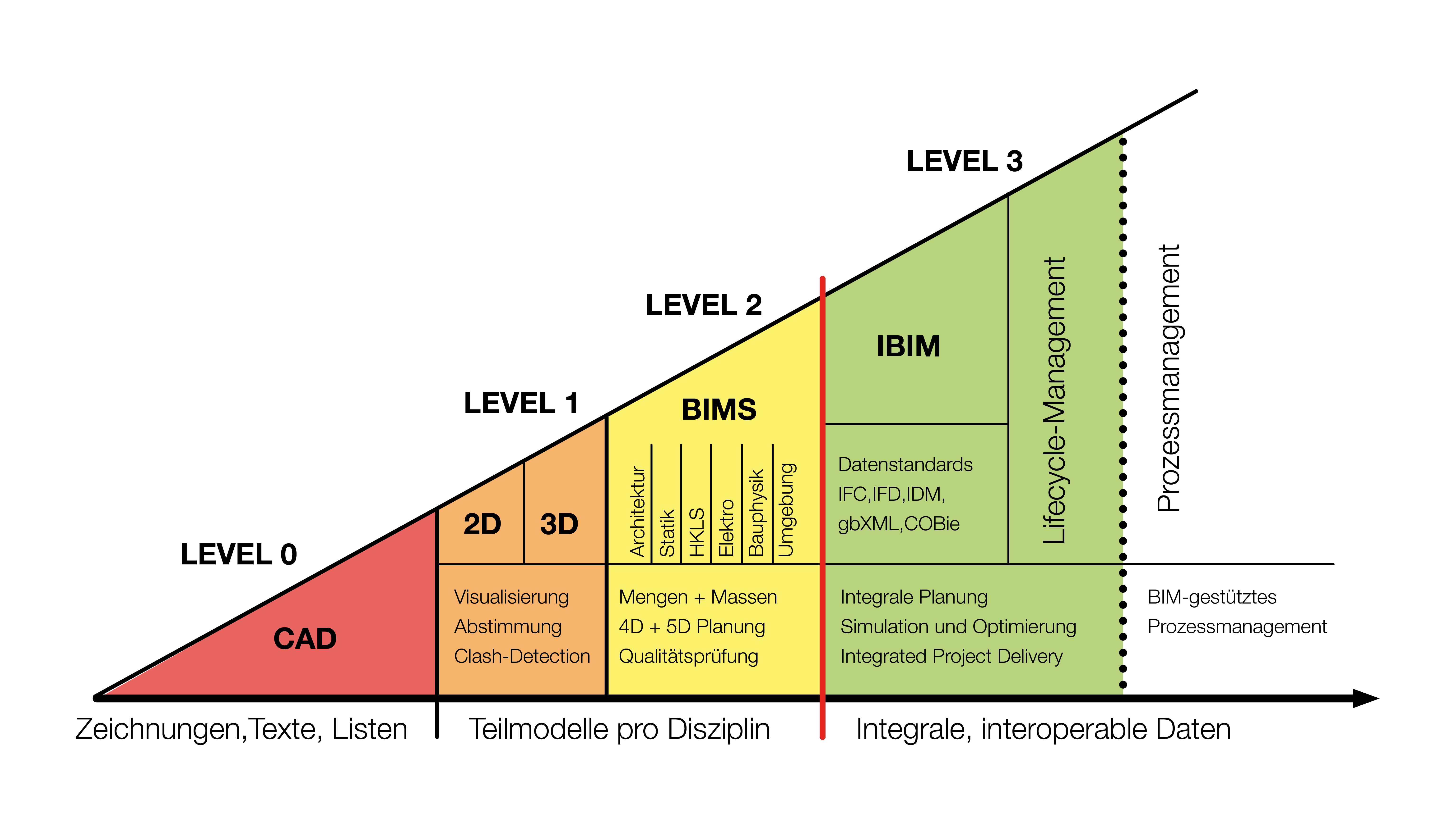 - Level 1 BIM: 2D, 3D; BIMS -> Teilmodelle pro Disziplin