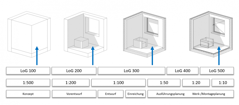 LoG-Vorgaben werden üblicherweise allgemein in Form von Auftraggeberinformationsanforderungen oder projektbezogen in BIM Abwicklungsplänen formuliert. Leider jedoch sind derartige Vorgaben selten ausreichend, um wirklich brauchbare Definitionen darüber zu treffen, wie detailliert wirklich modelliert werden soll. Die folgende Abbildung illustriert, wie die international gängige LoG-Definition im Verhältnis zu den im deutschsprachigen Raum üblicheren Maßstabs- und Leistungsphasen-Angaben steht: