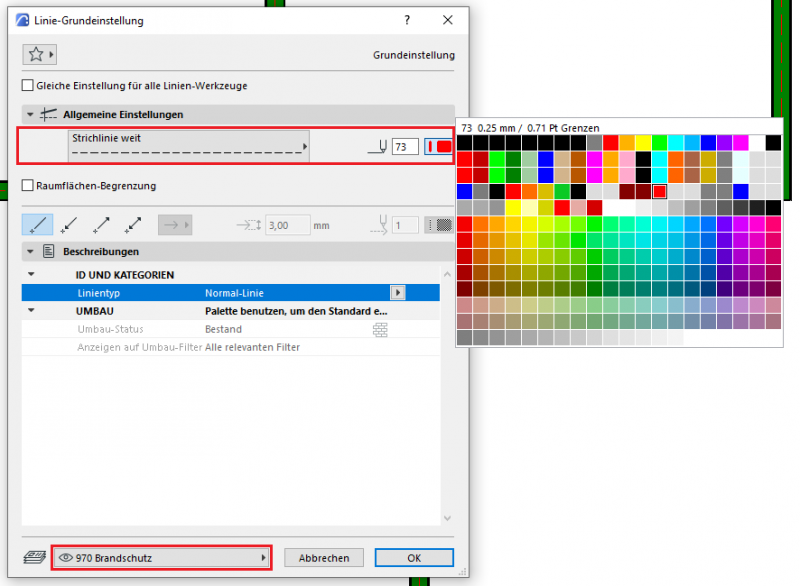 Brand- und Rauchabschnittsgrenzen können mit dem Linien-Werkzeug erstellt werden. Die Linien werden einer Ebene (Layer) und einem Stift zugeordnet, um ihre Sichtbarkeit und die Darstellung in den verschiedenen Ausschnitt-Sets zu bestimmen. Darüber hinaus kann man mit den Graphischen-Überschreibungsregeln zusätzliche Erscheinungsbilder erzeugen.
