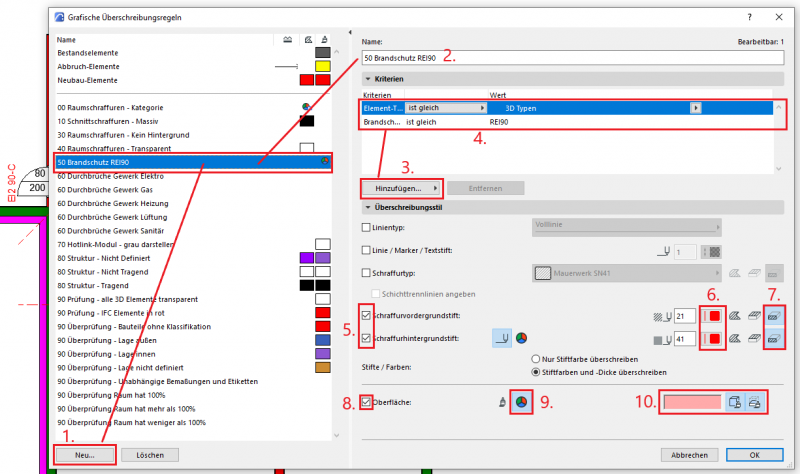 Für eine adequate Dartellung der Wände benötigt man entsprechende grafische Überschreibungsregeln. Im Folgenden zeigen wir ein Beispiel, wie eine derartige Regel aussehen kann. Nachdem diese Regel zu der gültigen grafischen Überschreibung hinzugefügt wird, können die Ausschnitte der Brandschutzplanung mit dieser versehen werden.