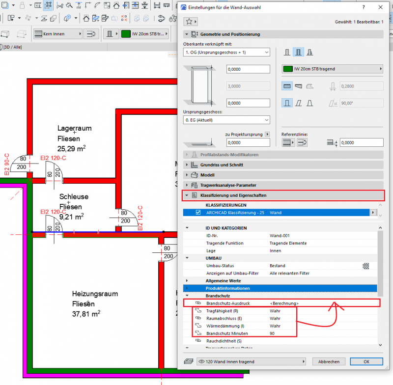 Die Brandschutzeigenschaften werden anschließend den Bauteilen, beispielsweise den Wänden, über diesen Parameter zugewiesen.