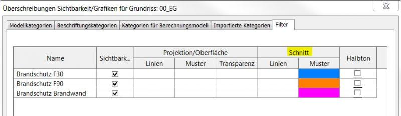 Danach werden Filter verwendet, die sich auf die Werte des entsprechenden Parameters beziehen. Je nach Brandschutzeigenschaft können mit Hilfe dieser Filter die Bauteile unterschiedlich dargestellt werden.