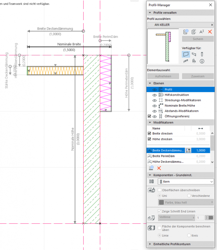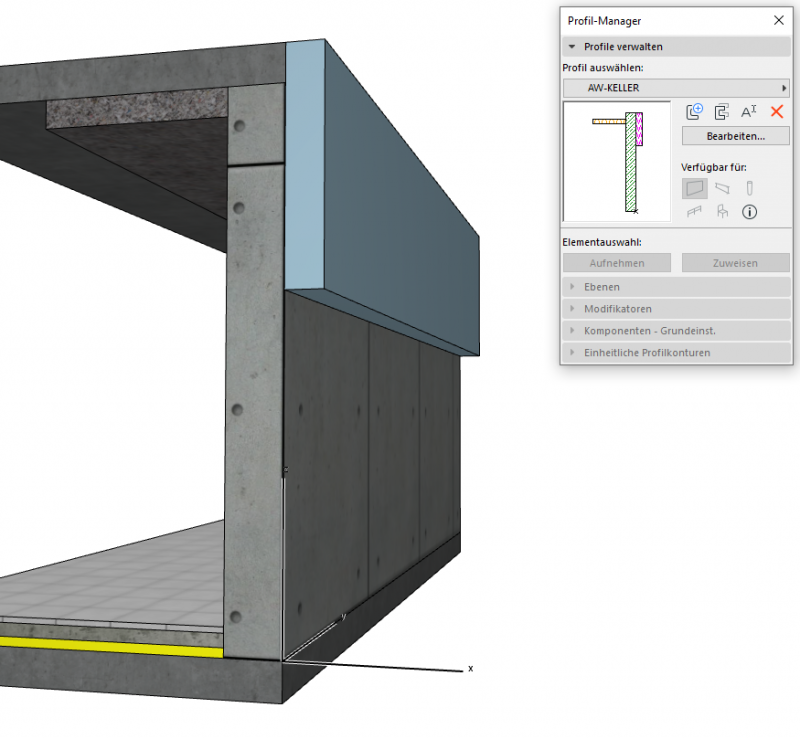 Eine Außenwand im Untergeschoss besteht nicht nur aus mehreren Schichten, sondern auch aus verschieden gearteten seitlichen Abschlüssen - seitliche Perimeterdämmung (nicht über die vollständige Wandoberfläche) und seitliche Innendämmung gegen Decke über UG. Daher ist eine Modellierung nur mit einem Mehrschichtigen Bauteil nicht ausreichend, und die Strukturmethode Komplexes Profil kommt zum Einsatz: