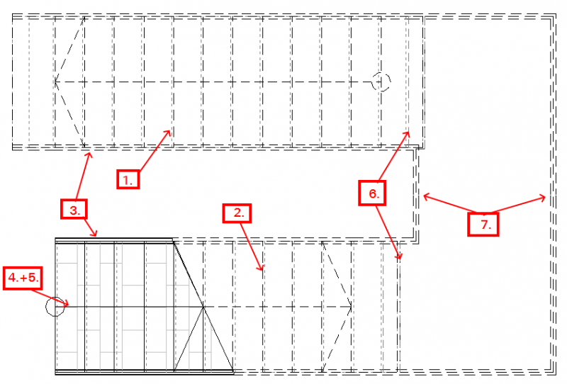 Im gewählten Grundriss anschließend die Treppe mit gewünschtem Verlauf skizzieren. Dabei ist darauf zu achten, dass die Mindestbreiten der Podeste bzw. die maximale Stufenanzahl der einzelnen Läufe bis zum nächsten Zwischenpodest eingehalten werden (immer gültige Normen beachten):