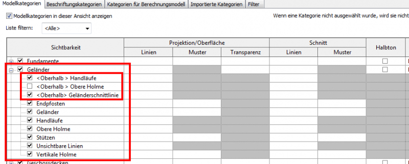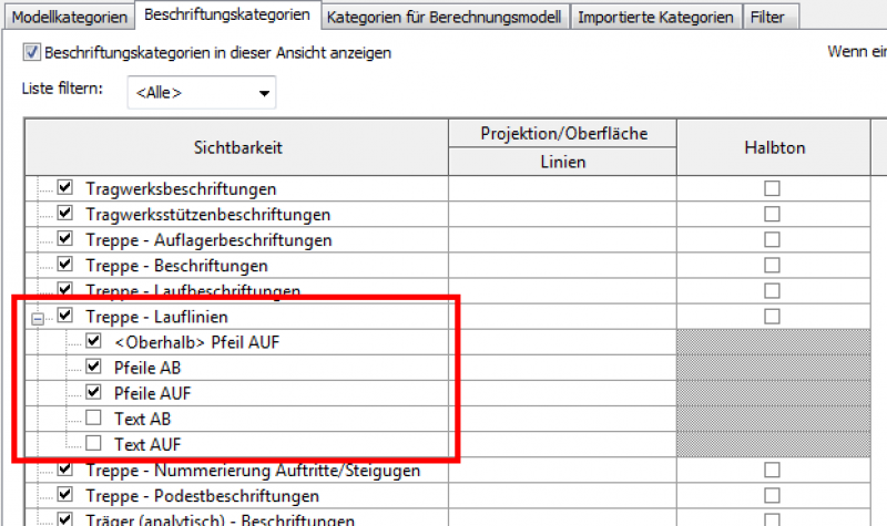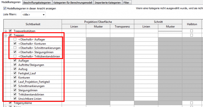 2. Mit den Unterkategorien der Treppen kann man unter anderem die gewünschten Linien Oberhalb der Schnittlinie überschreiben bzw. unsichtbar schalten.