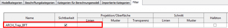 - Filter ARCH_Trep_BFT hinzufügen und die Projektionslinien wie gewünscht überschreiben. (Die engste Linie (annähernd Punklinie) ist die Linie Punkt_Gefälle)