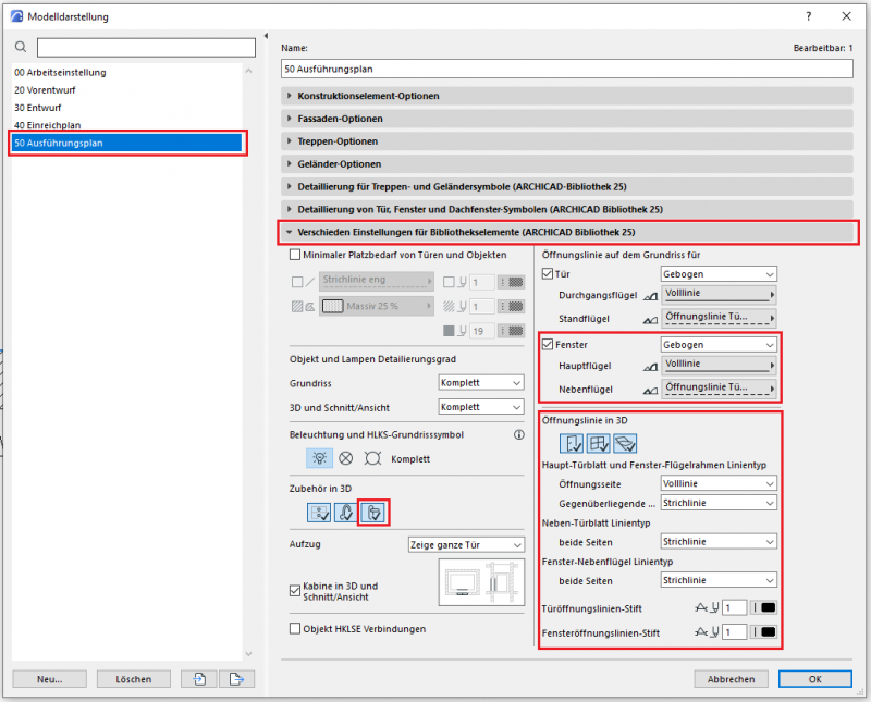 Der phasengerechte Detaillierungsgrad der Fenster kann mit der Modelldarstellungsoptionen reguliert werden. Wichtige Voraussetzung ist, dass die 2D- und 3D-Darstellungsoptionen in der Elementeinstellungen der Fenster auf „Nach Modelldarstellung“ gestellt wurden. In der Phase Ausführung sollten folgende Einstellungen durchgeführt werden.