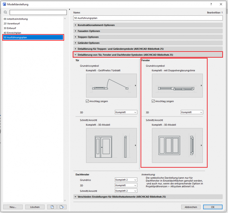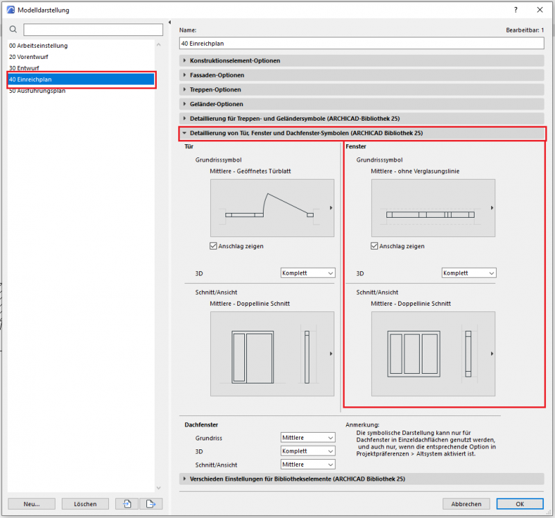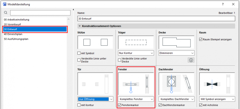 Der phasengerechte Detaillierungsgrad der Fenster kann mit der Modelldarstellungsoptionen reguliert werden. Wichtige Voraussetzung ist, dass die 2D- und 3D-Darstellungsoptionen in der Elementeinstellungen der Fenster auf „Nach Modelldarstellung“ gestellt wurden. In der Phase Entwurf sollten folgende Einstellungen durchgeführt werden.