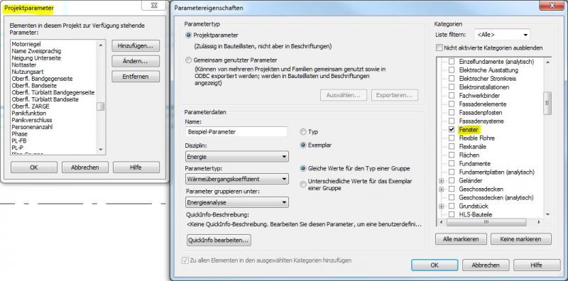 Die Eingabe von bauphysikalischen Eigenschaften erfolgt mittels spezieller Parameter, die über den Befehl >Verwalten >Projektparameter angelegt werden können: