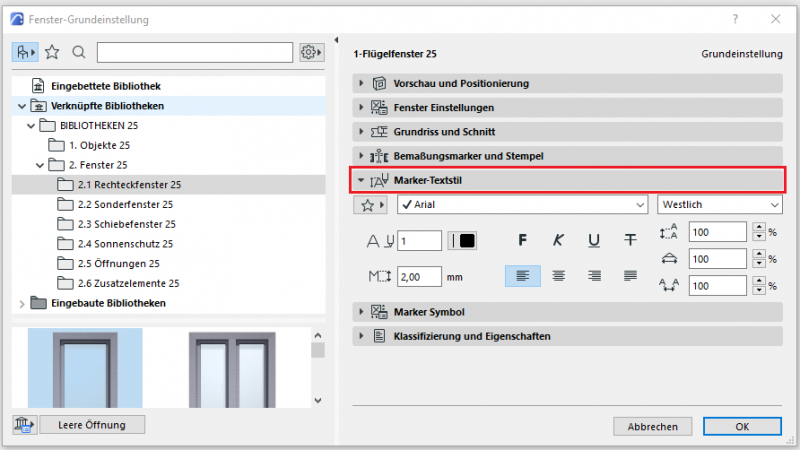 Die Beschriftung eines Fensters erfolgt über den im Einstellungsdialog vorhandenen Marker.