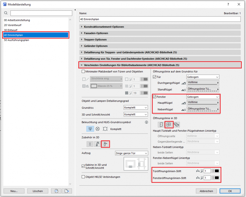 Der phasengerechte Detaillierungsgrad der Fenster kann mit der Modelldarstellungsoptionen reguliert werden. Wichtige Voraussetzung ist, dass die 2D- und 3D-Darstellungsoptionen in der Elementeinstellungen der Fenster auf „Nach Modelldarstellung“ gestellt wurden. In der Phase Einreichung sollten folgende Einstellungen durchgeführt werden.
