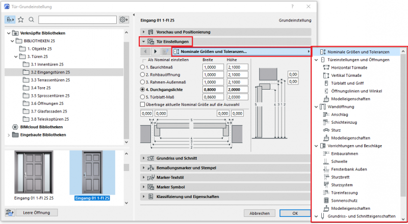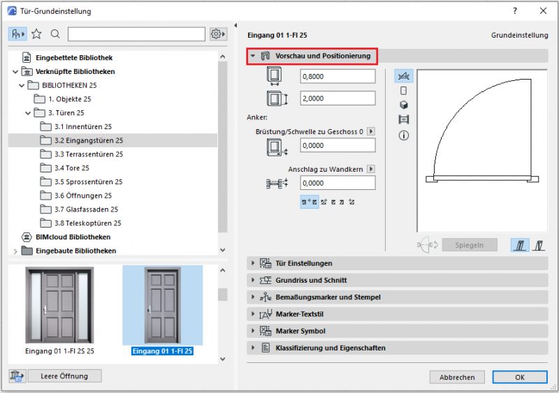 Die erste Registerkarte Vorschau und Positionierung zeigt die Grundmaße einer Tür - Breite/Höhe/Brüstung/Schwelle zu Geschoss/Anschlag können hier eingestellt werden. Die ausführlichen/spezifischen Einstellungen einer Tür befinden sich im nächsten Bereich des Menüs.