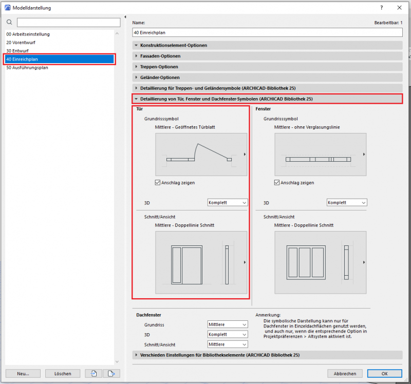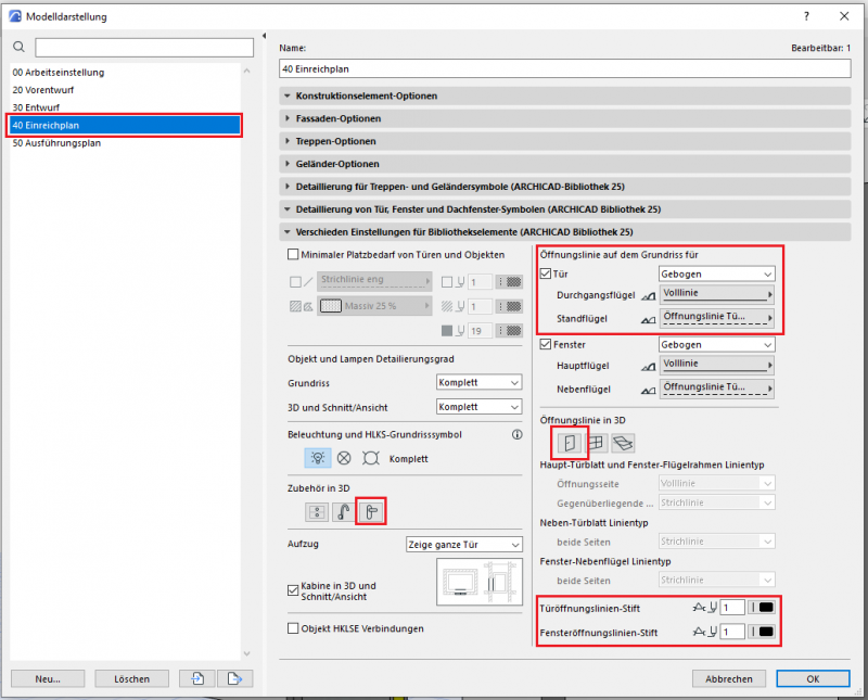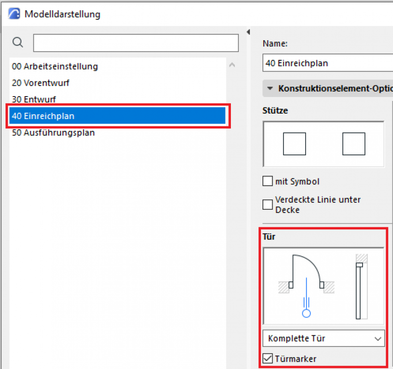 Der phasengerechte Detaillierungsgrad der Türen kann mit der Modelldarstellungsoptionen reguliert werden. Wichtige Voraussetzung ist, dass die 2D- und 3D-Darstellungsoptionen in der Elementeinstellungen der Türen auf „Nach Modelldarstellung“ gestellt wurden. In der Phase Einreichung sollten die folgenden Einstellungen durchgeführt werden.