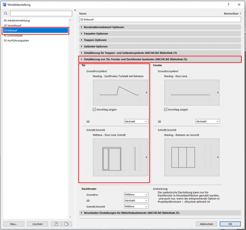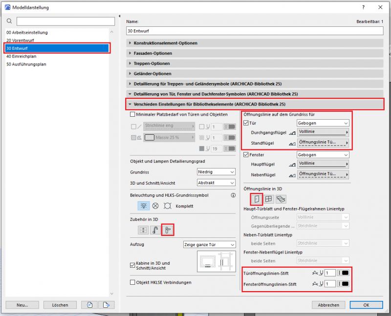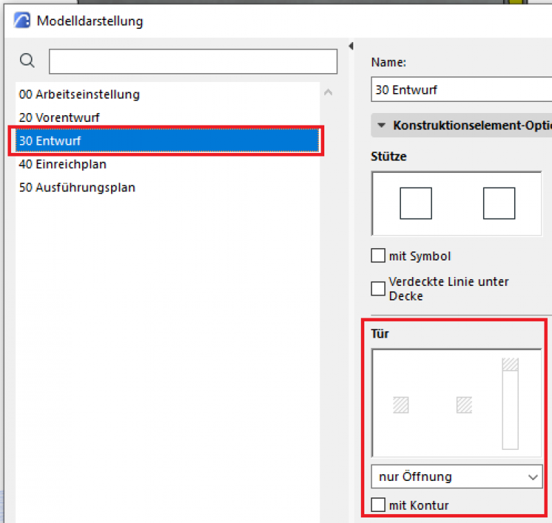 Der phasengerechte Detaillierungsgrad der Türen kann mit der Modelldarstellungsoptionen reguliert werden. Wichtige Voraussetzung ist, dass die 2D- und 3D-Darstellungsoptionen in den Elementeinstellungen der Türen auf „Nach Modelldarstellung“ gestellt wurde. In der Phase Entwurf sollten die folgenden Einstellungen durchgeführt werden.