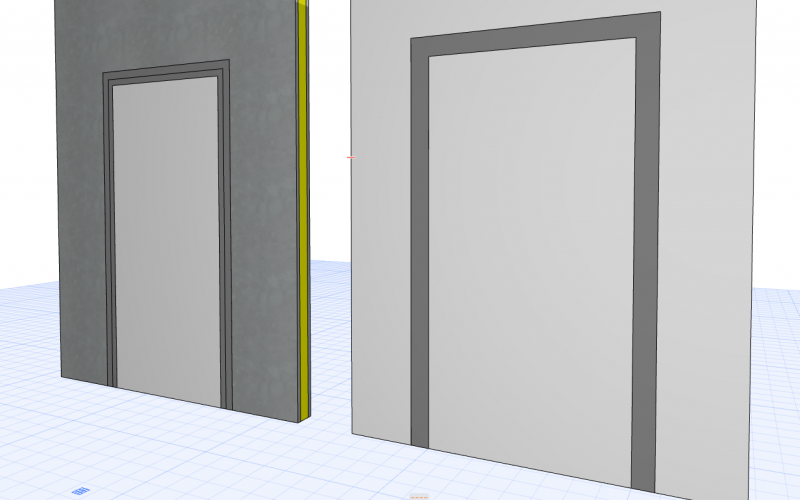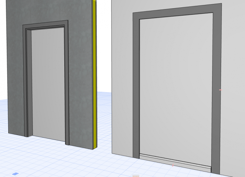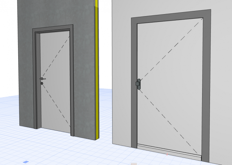Der Rahmen der Türen wurde detaillierter generiert. Die Griffe und die Öffnungslinien sind im 3D-Bereich noch ausgeblendet. Im Grundriss oder in den Schnitten/Ansichten die Darstellung der Rahmen vereinfacht ist.