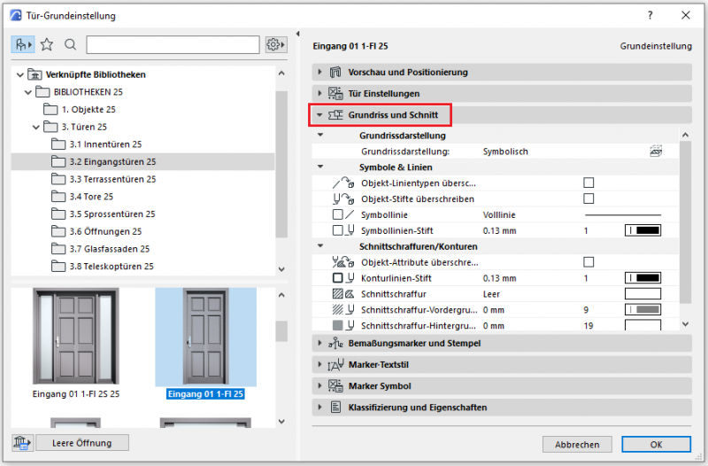 Im Bereich Grundriss und Schnitt können für die Tür die verschiedenen Grundrissdarstellungen eingestellt werden. Da die Tür mit der Darstellung einer Wand zusammenhängt wird hier in der Grundrissdarstellung Symbolisch eingestellt.