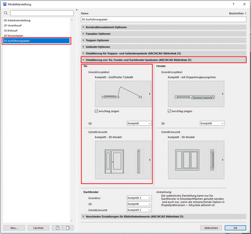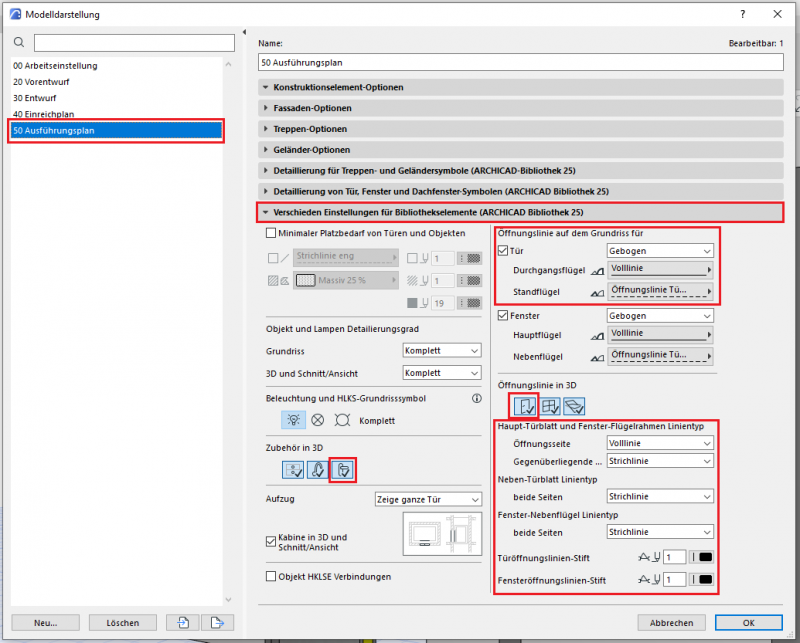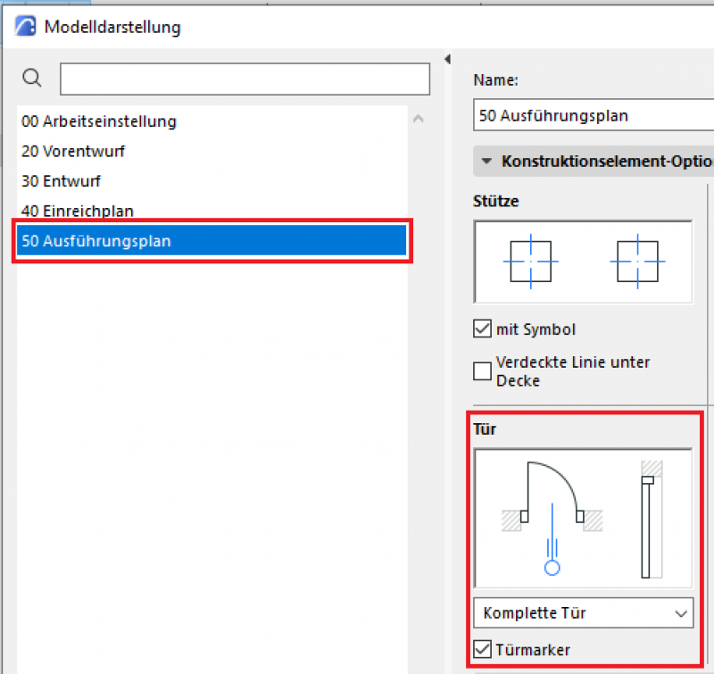 Der phasengerechte Detaillierungsgrad der Türen kann mit der Modelldarstellungsoptionen reguliert werden. Wichtige Voraussetzung ist, dass die 2D- und 3D-Darstellungsoptionen in der Elementeinstellungen der Türen auf „Nach Modelldarstellung“ gestellt wurden. In der Phase Ausführung sollten die folgenden Einstellungen durchgeführt werden.