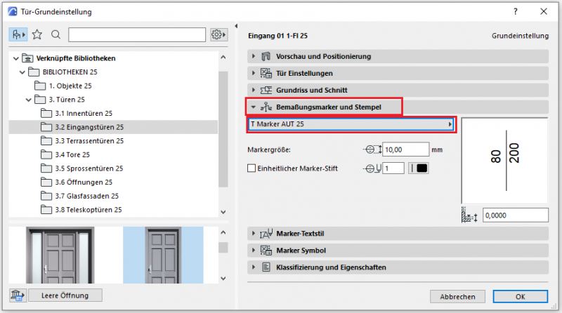 Wurde unter Bemaßungsmarker und Stempel der T Marker AUT 25 eingestellt, finden sich hier die Einstellungen dazu.
