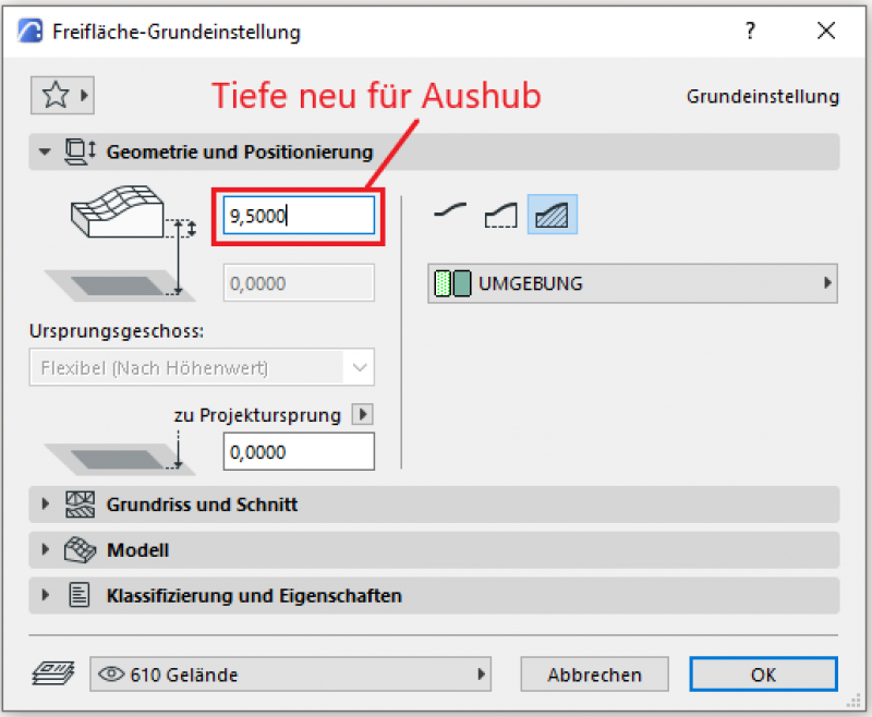 - Allgemeine: Name (Bezeichnung des Aushub-Bauteils)