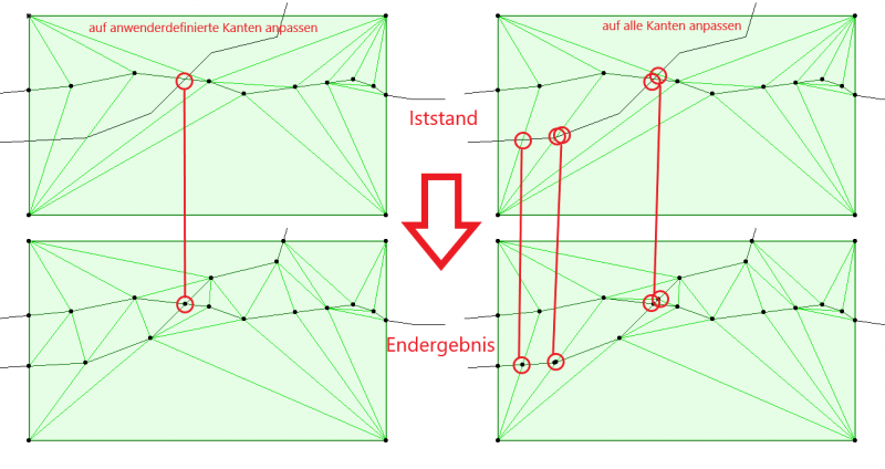 Mit der Option „Auf anwenderdefnierte Kanten anpassen“ werden nur die von uns erstellten Linien miteinander verschneiden. Mit der Option „auf alle Kanten anpassen“ werden die Polygonkanten der Freifläche mit der neuen Linie sich verschneiden.