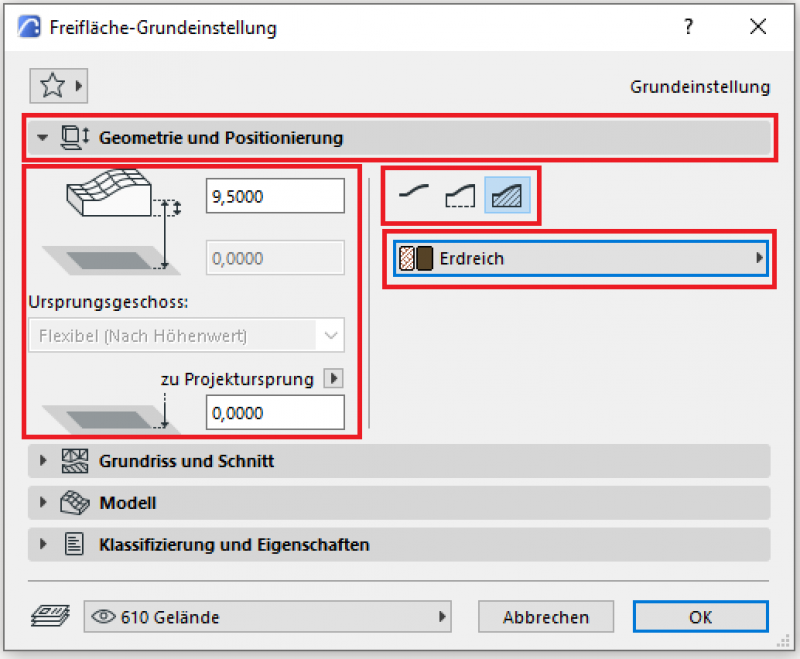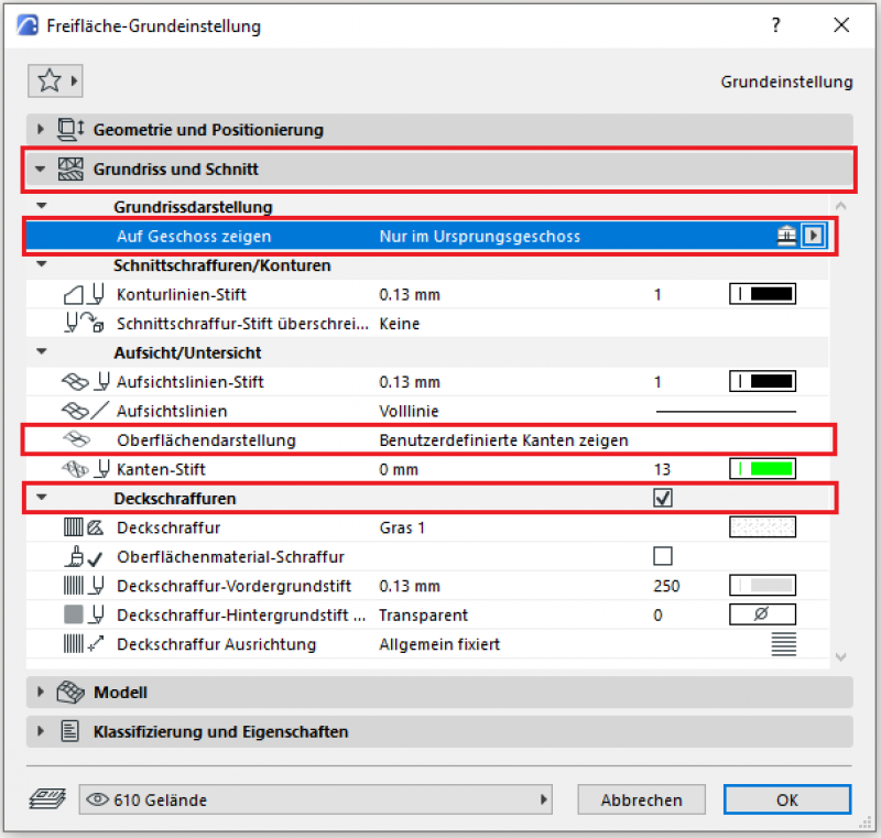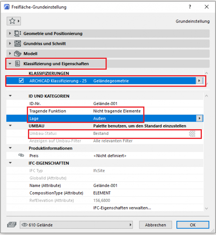 Die Element-Klassifizierung ist die erste Definition im Bereich Klassifizierung und Eigenschaften - s.a. Klassifizierung. Durch die Wahl der Klassifizierung auf Geländegeometrie werden auch nur die Merkmale im unteren Feldbereich angezeigt, die für diese Klassifizierung zur Verfügung stehen.