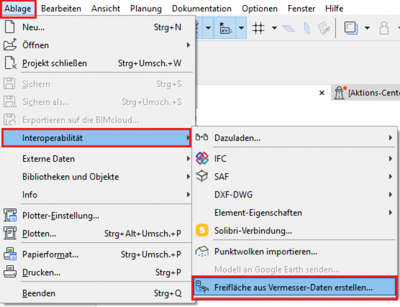 Eine neu zu erstellende Freifläche basiert meistens auf den Grundlagen-Daten des Vermessers (diese können 2D-, 3D-, oder Laser-Scan-Punktwolken sein). Die Vermesserdaten werden über Ablage > Interoperabilität > Dazuladen im Projekt platziert. Diese Daten werden üblicherweise bereits gemäß dem Projektursprung lt. Gauss-Krüger-System geliefert, dessen Lage in das Projekt übernommen werden sollte.