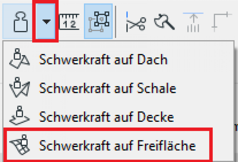 Um eine Freifläche mit Koten zu versehen wird das Höhenbemaßungs-Werkzeug ausgewählt und die Schwerkraft auf Freifläche eingestellt:
