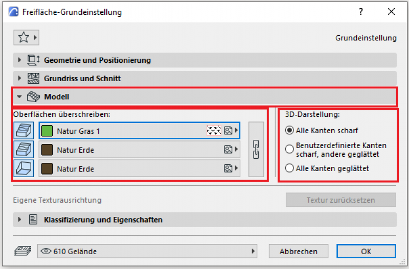 Im Bereich Modell kann die Oberfläche des verwendeten Baustoffes überschrieben werden. So kann z.B. für den Baustoff "Natur Erde" die Oberseite der Freifläche mit einer "Natur Gras"-Oberfläche neu definiert werden.