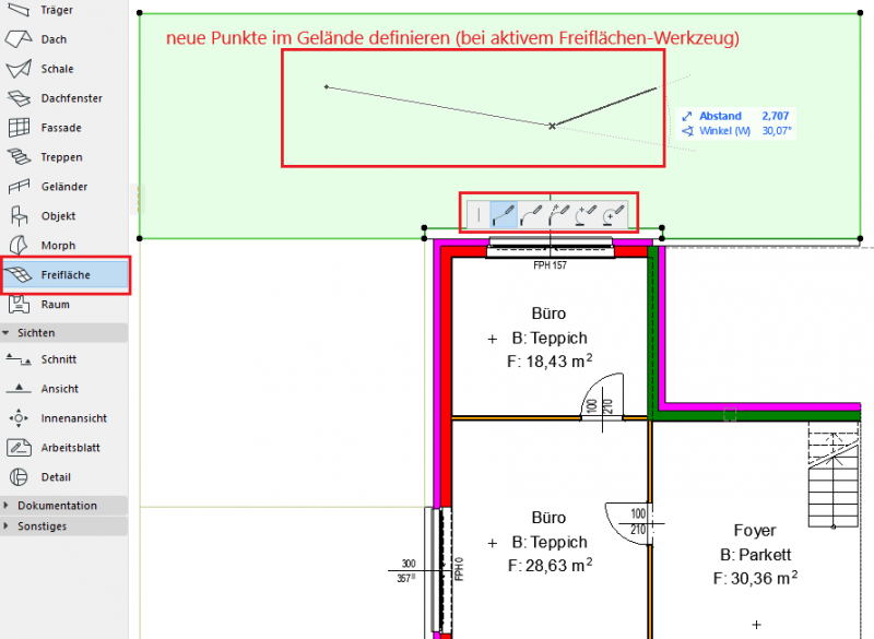 Um innerhalb der Freifläche neue Punkte/Geländeverlaufslinien zu generieren wird die Freifläche und zeitgleich das Freiflächen-Werkzeug ausgewählt - so können neue Einzelpunkte/Linien/Bögen etc. in das Gelände eingesetzt werden.