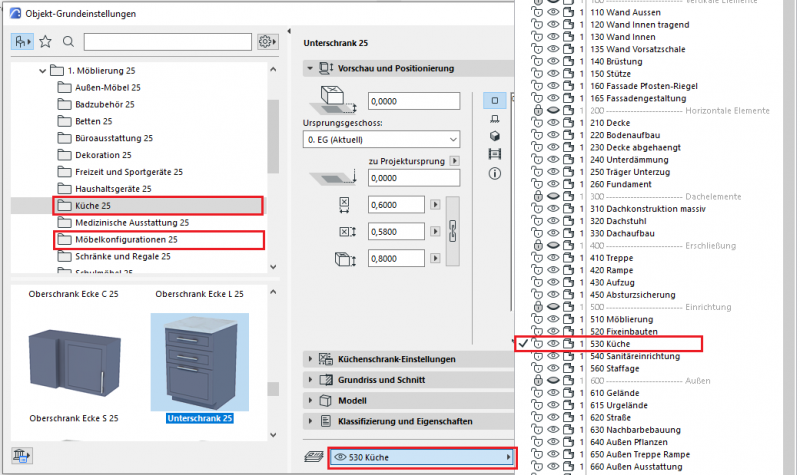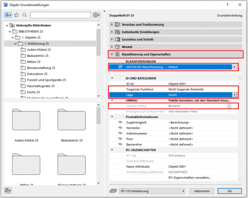 Info: Es ist darauf zu achten, welche Klassifizierung für bestimmte Einrichtungs-Objekte definiert wird: