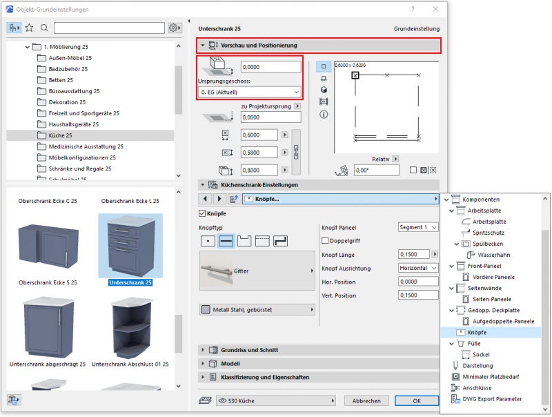Info: Das Möbelstück wird zum Ursprungsgeschoss + Höhe des Fußbodenaufbaus platziert.
