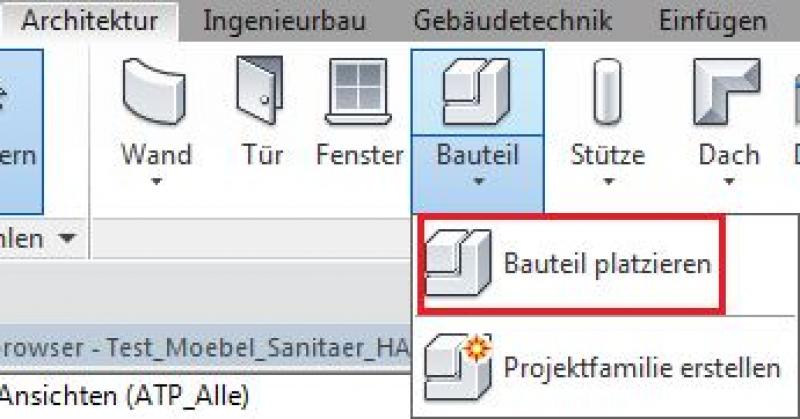 Küchen können in Revit aus Familien der Kategorien Möbel, Schreinerarbeiten oder Sanitärbauteile aufgebaut sein und werden wie alle weiteren Einrichtungsgegenstände (wie bspw. Möbel) mit dem Befehl >Architektur >Bauteil >Bauteil platzieren versetzt. Da sie nicht zur Palette der Systemfamilien sondern zu den sogenannten externen (='ladbaren') Familien gehören, müssen sie je nach Bedarf mit dem Befehl >Einfügen >Familie laden aus dem Revit-Content geladen werden.