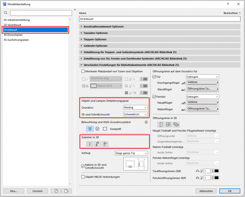 Der phasengerechte Detaillierungsgrad der Objekte kann mit der Modelldarstellungsoptionen reguliert werden. Wichtige Voraussetzung ist, dass die 2D- und 3D-Darstellungsoptionen in der Elementeinstellungen des Objektes auf „Nach Modelldarstellung“ gestellt wurden. In der Phase Entwurf sollten folgende Einstellungen durchgeführt werden.