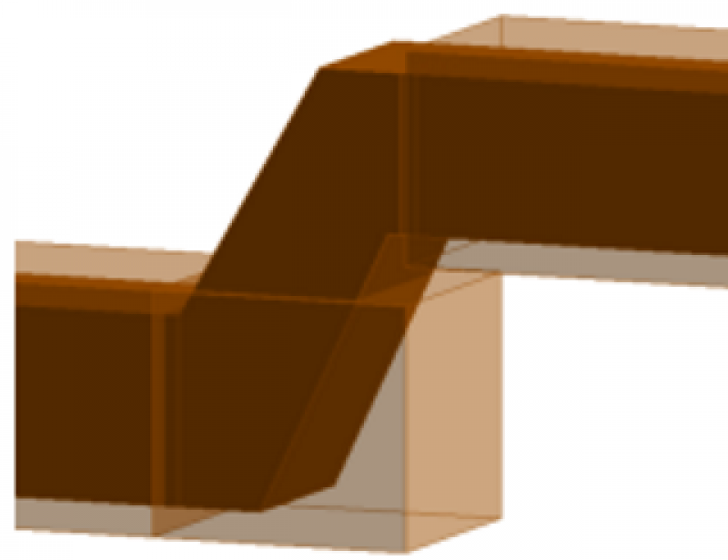 Der Versatz der Kanäle erfolgt je nach Lage zur entsprechenden Bezugsebene. Es wird ausschließlich die Achse "Mitte/Mitte" als Kanalausrichtung verwendet. Ein Höhenversatz zur Bezugsebene kann auch nachträglich durch Verschieben des Kanals im Schnitt erfolgen bzw. im Eigenschaftsfenster nummerisch angepasst werden.