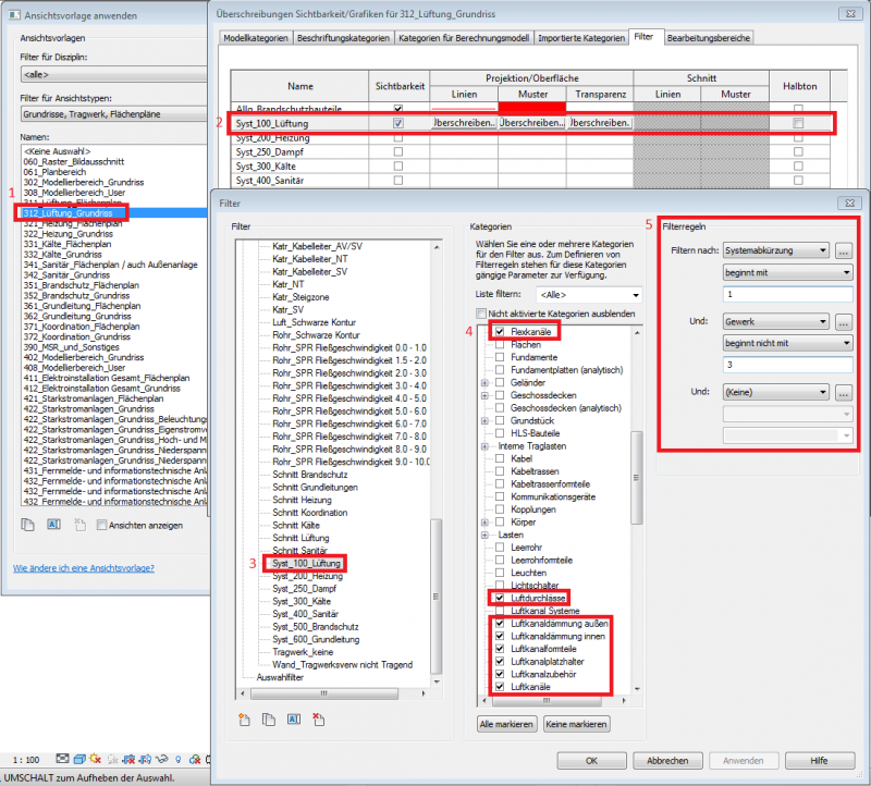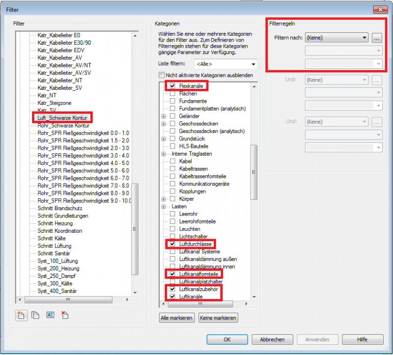 Die Sichtbarkeitseinstellung des Luftkanals erfolgt durch hinterlegte Filterregeln in den Ansichtsvorlagen.