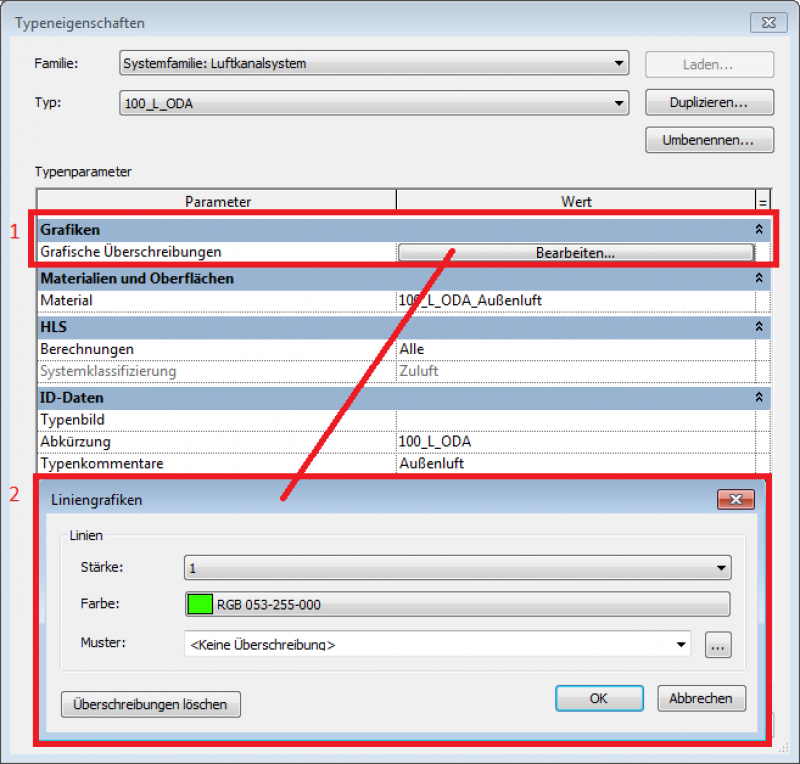 Die Farbzuweisung der Kontur (Linien) wird hingegen durch den Parameter Grafiken > Grafische Überschreibungen des Systemtyps gesteuert.
