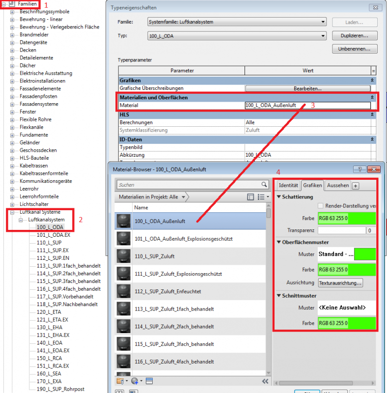 In den Typeneigenschaften der Familie Rohrsysteme werden die Farbzuweisung der Füllfläche über den Parameter Material und Oberfläche des Systemtyps gesteuert.