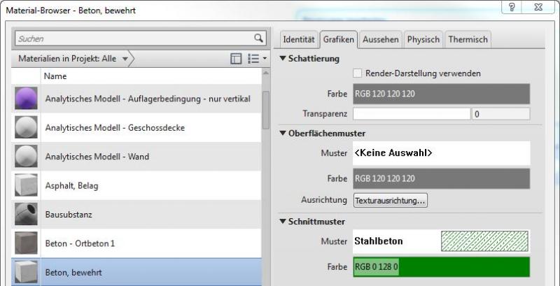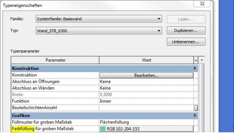 In Revit können die spezifischen farbigen Darstellungen für Einreichpläne (Genehmigungspläne) im Material bzw. im Typ definiert werden:Farbe im Typ: