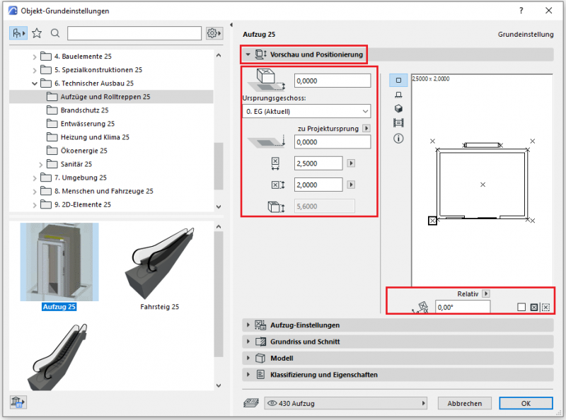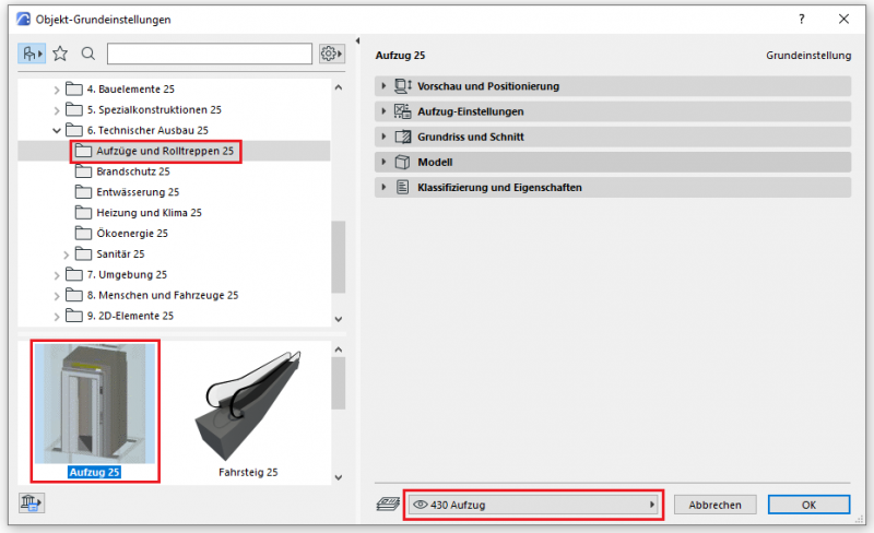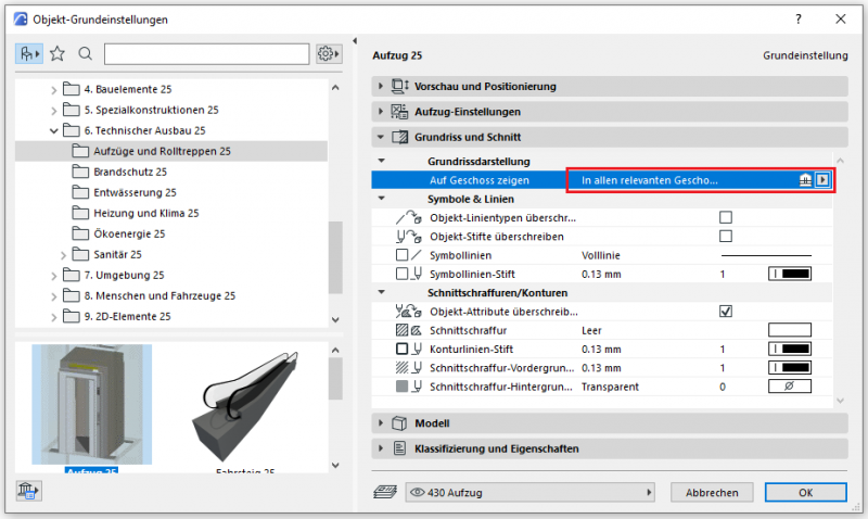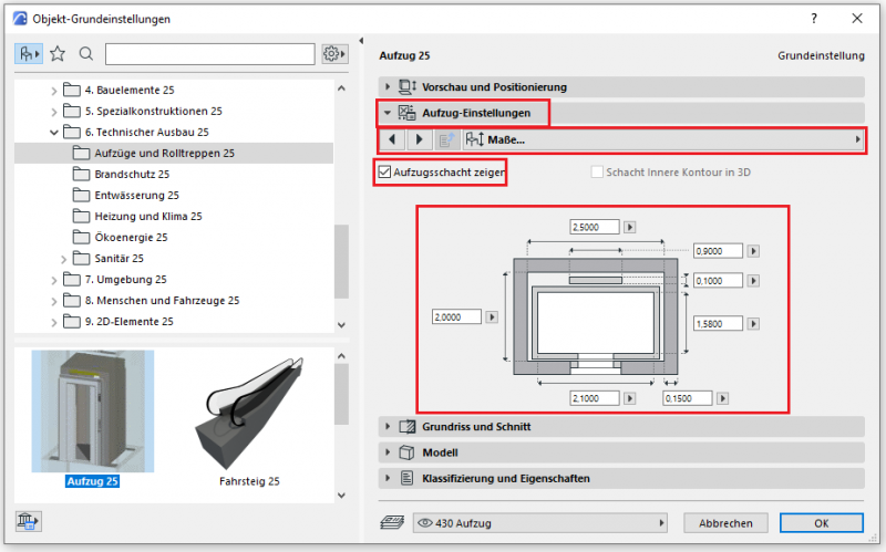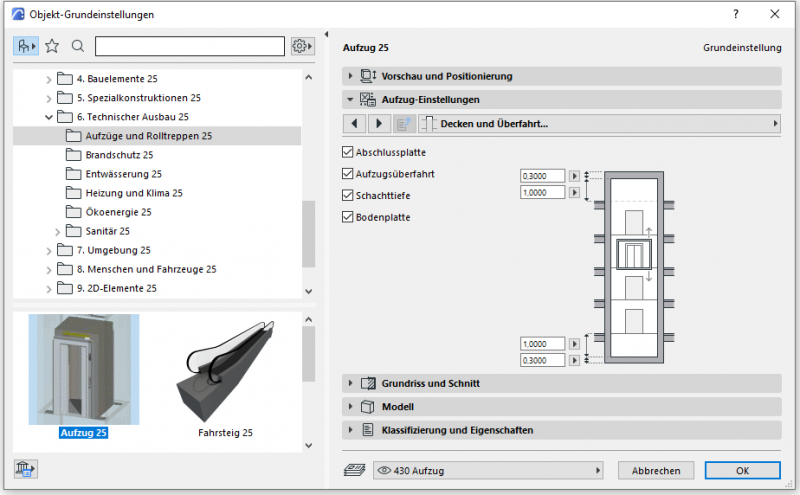 Für die grundsätzliche Verwendung des Bibliothekselementes Aufzug verweisen wir auf die Basisdokumentation von Graphisoft im Help-Center.