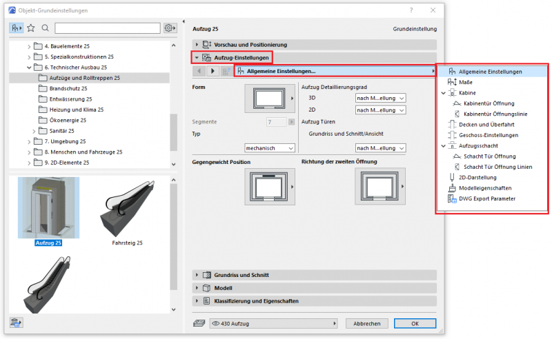 In den Einstellungen des Aufzuges (analog auch für Rolltreppen und Fahrsteige) werden zunächst die Allgemeinen Einstellungen bezüglich der Form, der Anzahl der Türöffnungen und der Position des Gegengewichtes getroffen: