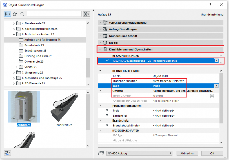 Rohbau-Bestandteile des Aufzuges sind tragende Elemente und sollten im Eigenschaftenfenster immer als tragend markiert werden.
