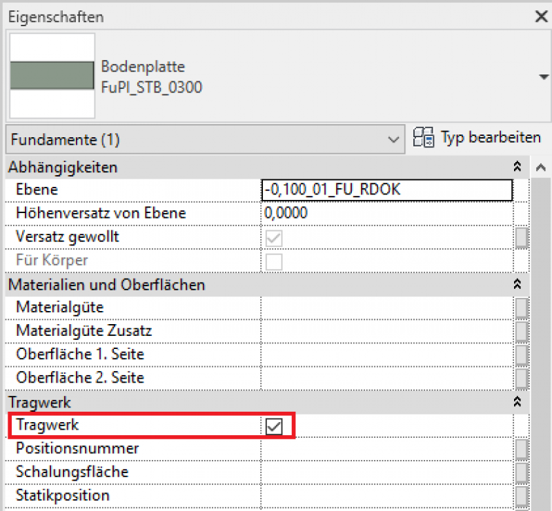 Fundamente sind tragende Elemente und sollten im Eigenschaftenfenster immer als tragend markiert werden (Parameter: Tragwerk):