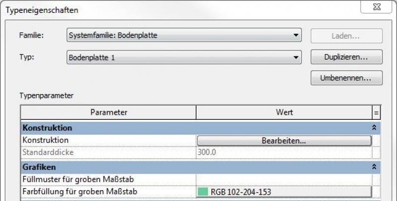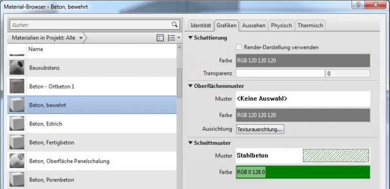 In Revit können die spezifischen farbigen Darstellungen für Einreichpläne (Genehmigungspläne) im Material bzw. im Typ definiert werden: